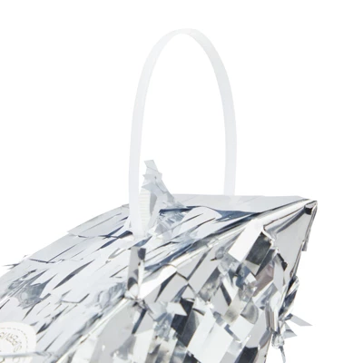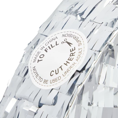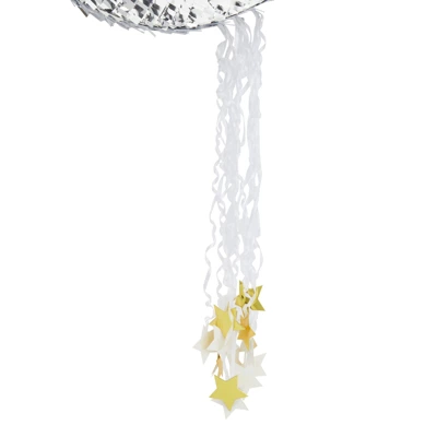 - Material: The interior of the small pinata is made of corrugated paper; the exterior is decorated with silver tissue paper with gold star pull strings at the bottom