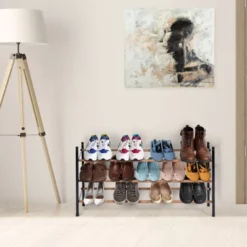 Juvale Free Standing 3 Tier 18 Pair Shoe Rack Shelf Organizer For Entryway Closet, 24″-45″ Expandable, Black & Oak Grain Metal