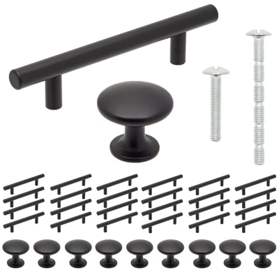 Timeless and elegant, this set of 26 beautiful black matte 3.75 inch drawer pulls and 10 black matte 1-inch cabinet knobs are the ideal replacements for your old cupboard handles and knobs that might be broken or worn down, or that simply don’t match the room decor. These stylish and attractive stainless steel cabinet knobs and kitchen cabinet handles will bring your old dresser drawers, kitchen cabinets, or bathroom vanity back to life! The package includes 2 M4x25 screws for each drawer pull and 1 for each knob. The same number of M4x40 breakaway machine screws are included for installation onto thicker drawer/cabinet faces. Each order includes 26 drawer pulls, 10 cabinet knobs, 62 M4x25 screws, and 62 M4x40 breakaway screws. Each of these cabinet pulls and knobs feature a matte black finish.