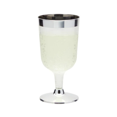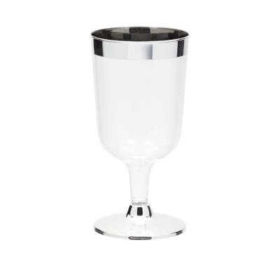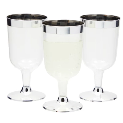 Enhance the sophistication and allure of your event with our exquisite wine goblet set! Imbued with a silver-rimmed finish, these clear plastic cups exude elegance, rendering them a splendid choice for weddings, birthday soirées, enigmatic wine tastings, enchanting dinners, and bridal showers. Not only do these resplendent plastic wine glasses exude refinement, but they also serve as delightful vessels for delectable desserts. Revel in the pleasure of serving ice cream, candies, luscious puddings, and velvety custards in these resplendent goblets, elevating the indulgence of your culinary creations. Prepare to receive a generous bounty of 50 clear plastic disposable goblet wine glasses, helping to ensure an abundance of sparkling beauty to grace your festivities. To make things even better, the plastic goblets for parties disposable design makes cleanup a breeze. Adorned with a sophisticated design, these goblets transcend ordinary tableware, offering a sublime canvas for a myriad of drinks, including the finest wines, tantalizing cocktails, and exquisite punches.