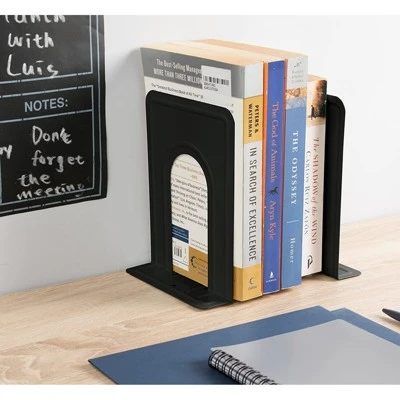 Keep your notebooks, novelties, magazines, file folders, and books organized with these handy iron metal bookends. Place the book holders for shelves anywhere, ranging from tables and mantles to shelves. These bookends are made of sturdy and durable iron and feature non-skid pads on the bottom to prevent slipping. You’ll receive 6 pairs of bookends for shelves. Each black bookend measures approximately 5 x 6.75 x 5.75 inches.