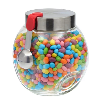 - Candy Jar With Scoop and Lid: Use this clear candy jar to hold a variety of food, such as cookies, sweets, and dog treats; ideal for storing household items, coins, and trinkets