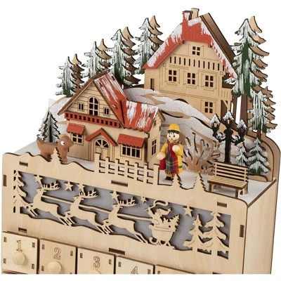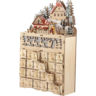 There is no better way to count down the days until Christmas than with a beautifully decorated and carved wood Christmas advent calendar. This calendar, featuring elegant carvings and 24 numbered little treasure boxes, that are the perfect way to allow children to engage in the excitement of a holiday countdown. Store candy, toys, money and more in each box and watch the surprise on their faces each morning. Put 2 AA batteries (not included) and see the beautiful Christmas scene light up.